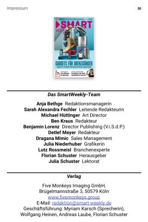 Five Monkeys Imaging GmbH, Brügelmannstraße 3, 50579 Köln www. fivemonkeys. group E-Mail: redaktion @ smart-weekly. de Geschäftsführung: Myriam Karsch( Sprecherin), Wolfgang Heinen, Andreas Laube, Florian Schuster