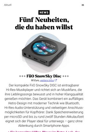 Der kompakte FiiO SnowSky DISC ist eintragbarer Hi‐Res‐Musikplayer und richtet sich an Musikfans, die ihre Lieblingssongs bewusst und in hoher Klangqualität genießen möchten. Das Gerät kombiniert ein auffälliges Retro-Design mit moderner Technik wie Bluetooth, Hi-Res-Audio-Unterstützung und vielseitigen Anschlussmöglichkeiten für Kopfhörer. Dank Speichererweiterung per microSD und bis zu rund zwölf Stunden Akkulaufzeit eignet sich der Player ideal für unterwegs – ganz ohne Ablenkung durch Smartphone-Apps.