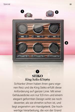 Schlanke Uhren haben ihren ganz eigenen Reiz und die King Seiko erfüllt diese Anforderung auf ganzer Linie. Mit einer Gehäusedicke von nur 9,9 mm und einem elegant geformten Design wirkt sie noch dezenter, als sie ohnehin schon ist, und liegt angenehm am Handgelenk. Die hochwertige Verarbeitung, die von der Grand Seiko inspiriert wurde, verleiht ihr den letzten Schliff und macht deutlich, warum diese Uhr den Titel „ King“ wirklich verdient. 3.200 Euro, weitere Infos �