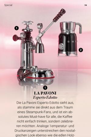 Die La Pavoni Esperto Edotto sieht aus, als stamme sie direkt aus dem Traum eines Steampunk-Fans, und ist ein absolutes Must-have für alle, die Kaffee nicht einfach trinken, sondern zelebrieren möchten. Analoge Temperatur- und Druckanzeigen unterstreichen den nostalgischen Look ebenso wie die edlen Holzgriffe. Das i-Tüpfelchen ist ein goldfarbener Vogel auf der Oberseite, der genauso stilvoll ist wie die Kühlerfigur auf einem Rolls-Royce. 1.400 Euro, weitere Infos �