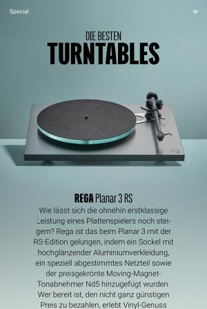 REGA Planar 3 RS Wie lässt sich die ohnehin erstklassige Leistung eines Plattenspielers noch steigern? Rega ist das beim Planar 3 mit der RS-Edition gelungen, indem ein Sockel mit hochglänzender Aluminiumverkleidung, ein speziell abgestimmtes Netzteil sowie der preisgekrönte Moving-Magnet- Tonabnehmer Nd5 hinzugefügt wurden. Wer bereit ist, den nicht ganz günstigen Preis zu bezahlen, erlebt Vinyl-Genuss auf höchstem Niveau.