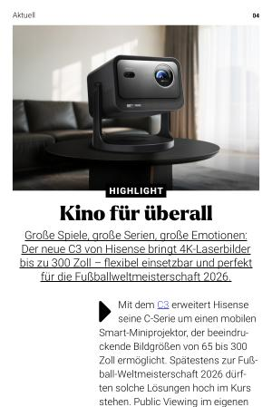 Mit dem C3 erweitert Hisense seine C-Serie um einen mobilen Smart-Miniprojektor, der beeindruckende Bildgrößen von 65 bis 300 Zoll ermöglicht. Spätestens zur Fußball-Weltmeisterschaft 2026 dürften solche Lösungen hoch im Kurs stehen. Public Viewing im eigenen Garten, das entscheidende Gruppenspiel im Wohnzimmer oder das Finale mit Freunden im Partykeller – der C3 verwandelt nahezu jede Fläche in eine Großbildbühne.