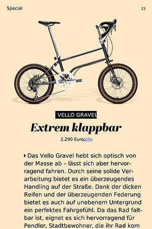 � Das Vello Gravel hebt sich optisch von der Masse ab – lässt sich aber hervorragend fahren . Durch seine solide Verarbeitung bietet es ein überzeugendes Handling auf der Straße . Dank der dicken Reifen und der überzeugenden Federung bietet es auch auf unebenem Untergrund ein perfektes Fahrgefühl . Da das Rad faltbar ist , eignet es sich hervorragend für Pendler , Stadtbewohner , die ihr Rad kompakt in der Wohnung verstauen wollen , und auf Reisen , da es sich zusammengeklappt bequem transportieren lässt .