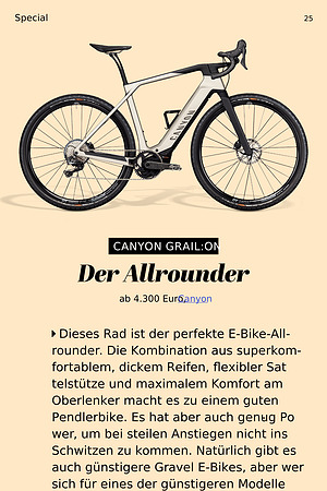 � Dieses Rad ist der perfekte E-Bike-Allrounder . Die Kombination aus superkomfortablem , dickem Reifen , flexibler Sattelstütze und maximalem Komfort am Oberlenker macht es zu einem guten Pendlerbike . Es hat aber auch genug Power , um bei steilen Anstiegen nicht ins Schwitzen zu kommen . Natürlich gibt es auch günstigere Gravel E-Bikes , aber wer sich für eines der günstigeren Modelle entscheidet , wird immer wieder neidisch auf die Grail : ON Modelle blicken .