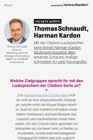 Welche Zielgruppen sprecht ihr mit den Lautsprechern der Citation-Serie an ? � „ Die Harman Kardon Citation-Serie richtet sich an eine anspruchsvolle Zielgruppe , welche nicht der Masse folgen möchte . Qualität und Authentizität haben einen hohen Stellenwert und beeinflussen das Handeln und Kaufverhalten dieser Menschen . Mit der Citation-Serie sprechen wir Menschen an , die bereit sind , in Geräte zu investieren , welche eine hervorragende Klangqualität liefern und sich zugleich durch ihr Design und organische Materialien in moderne Wohnumgebungen bestens einfügen .“