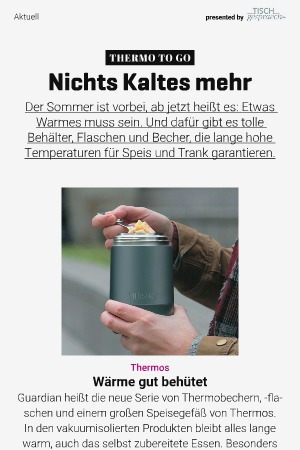 Thermos Wärme gut behütet Guardian heißt die neue Serie von Thermobechern , -flaschen und einem großen Speisegefäß von Thermos . In den vakuumisolierten Produkten bleibt alles lange warm , auch das selbst zubereitete Essen . Besonders genial unterstützt der praktische Hydration Tracker an der 0,7-Liter-Isolier-Trinkflasche die bewusste Flüssigkeitszufuhr : Auf dem drehbaren Ring lässt sich von 1 bis 6 einstellen , wie oft die Trinkflasche geleert wurde . Ein klappbarer Edelstahllöffel im Deckel des Speisegefäßes macht unabhängig von anderem Besteck . ab 28 Euro , weitere Infos �