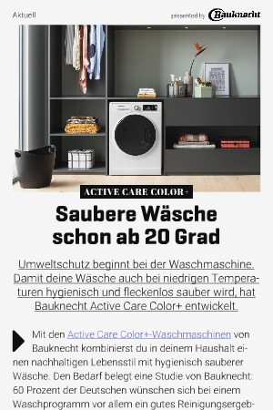 Bauknecht kombinierst du in deinem Haushalt einen nachhaltigen Lebensstil mit hygienisch sauberer Wäsche . Den Bedarf belegt eine Studie von Bauknecht : 60 Prozent der Deutschen wünschen sich bei einem Waschprogramm vor allem ein gutes Reinigungsergebnis , gefolgt von einem geringen Energieverbrauch ( 45 Prozent ). Und so kannst du bei den neuen Bauknecht- Waschmaschinen die Active-Care-Option bei sechs Waschprogrammen hinzuwählen . Diese kombiniert insgesamt drei Technologien , die im Antiflecken-Programm mehr als 100 Flecken bei nur 20 Grad Celsius entfernen . Klasse : Gleichzeitig wird die Lebensdauer dunkler Farben verdoppelt .