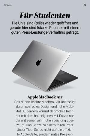 Apple MacBook Air Das dünne , leichte MacBook Air überzeugt durch sein edles Design und hohe Mobilität . Außerdem kommt der mobile Rechner mit dem hauseigenen M1-Prozessor , der mit seiner sehr hohen Leistung überzeugt . Das Ganze zu einem fairen Preis . Unser Tipp : Schau nicht auf die offizielle Apple-Seite , sondern nutze Preisvergleichsportale , um unter die magische 1.000- Euro-Grenze zu kommen .