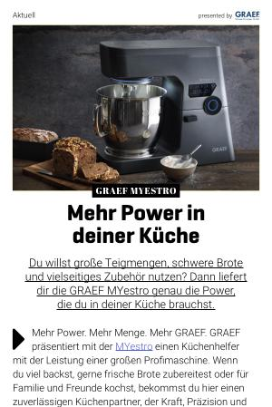 Mehr Power. Mehr Menge. Mehr GRAEF. GRAEF präsentiert mit der MYestro einen Küchenhelfer mit der Leistung einer großen Profimaschine. Wenn du viel backst, gerne frische Brote zubereitest oder für Familie und Freunde kochst, bekommst du hier einen zuverlässigen Küchenpartner, der Kraft, Präzision und Komfort in einem Gerät vereint.