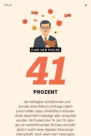 ... der befragten Schülerinnen und Schüler einer Bitkom-Umfrage haben schon erlebt, dass Lehrkräfte in Klassenchats absichtlich beleidigt oder verspottet wurden. 84 Prozent der 14- bis 19-Jährigen an weiterführenden Schulen sind Mitglied in solch einer digitalen Klassengemeinschaft. Auch wenn dort meist ganz harmloses Schul- und Alltagsmanagement stattfindet, macht diese Zahl deutlich, dass Digitalkompetenz dringend auf den Stundenplan sollte. Denn gegenseitiger Respekt gilt im Netz genauso wie im Klassenzimmer.