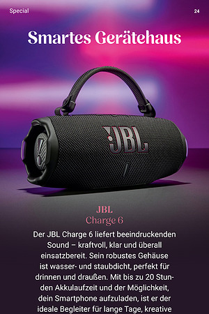 Der JBL Charge 6 liefert beeindruckenden Sound – kraftvoll, klar und überall einsatzbereit. Sein robustes Gehäuse ist wasser- und staubdicht, perfekt für drinnen und draußen. Mit bis zu 20 Stunden Akkulaufzeit und der Möglichkeit, dein Smartphone aufzuladen, ist er der ideale Begleiter für lange Tage, kreative Projekte oder einfach entspannte Musik zwischendurch. 150 Euro, weitere Infos �