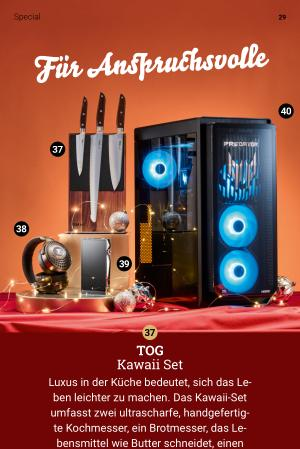 Luxus in der Küche bedeutet, sich das Leben leichter zu machen. Das Kawaii-Set umfasst zwei ultrascharfe, handgefertigte Kochmesser, ein Brotmesser, das Lebensmittel wie Butter schneidet, einen doppelseitigen, magnetischen Messerblock namens TOG X Billy Tannery und sogar einen Wetzstahl, um die Klingen scharf zu halten. Die Qualität ist absolut spitze. Aber: Diese Messer gehören nicht in die Spülmaschine.