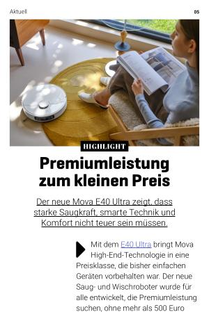 � Alles in einem: Der Mova E40 Ultra mit smarter All-in-One-Station für automatische Reinigung und Trocknung. unterscheidet. Dabei hebt der Roboter den Mopp um 10,5 mm an und verstärkt gleichzeitig die Saugkraft – ideal, um Teppiche trocken und sauber zu halten. Auch hartnäckiger Schmutz ist für den