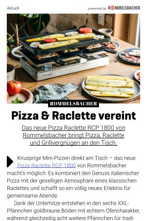 Das neue Pizza Raclette RCP 1800 von Rommelsbacher bringt Pizza, Raclette und Grillvergnügen an den Tisch.