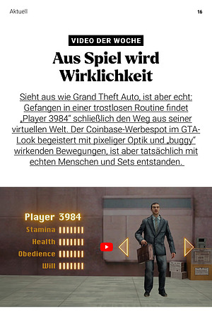 Sieht aus wie Grand Theft Auto, ist aber echt: Gefangen in einer trostlosen Routine findet „ Player 3984“ schließlich den Weg aus seiner virtuellen Welt. Der Coinbase-Werbespot im GTA- Look begeistert mit pixeliger Optik und „ buggy“ wirkenden Bewegungen, ist aber tatsächlich mit echten Menschen und Sets entstanden.