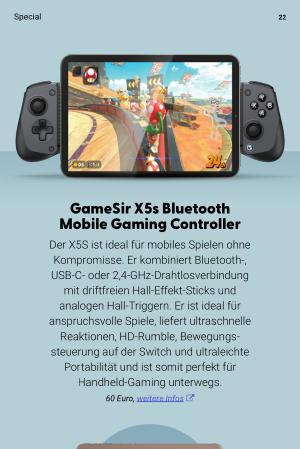 Der X5S ist ideal für mobiles Spielen ohne Kompromisse. Er kombiniert Bluetooth-, USB-C- oder 2,4-GHz-Drahtlosverbindung mit driftfreien Hall-Effekt-Sticks und analogen Hall-Triggern. Er ist ideal für anspruchsvolle Spiele, liefert ultraschnelle Reaktionen, HD-Rumble, Bewegungs- steuerung auf der Switch und ultraleichte Portabilität und ist somit perfekt für Handheld-Gaming unterwegs. 60 Euro, weitere Infos �