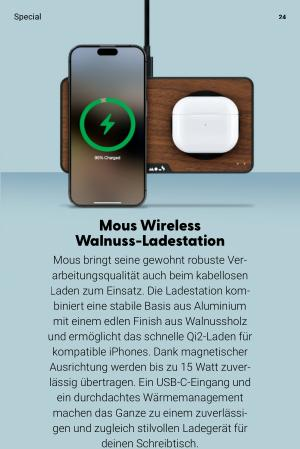 Mous bringt seine gewohnt robuste Verarbeitungsqualität auch beim kabellosen Laden zum Einsatz. Die Ladestation kombiniert eine stabile Basis aus Aluminium mit einem edlen Finish aus Walnussholz und ermöglicht das schnelle Qi2-Laden für kompatible iPhones. Dank magnetischer Ausrichtung werden bis zu 15 Watt zuverlässig übertragen. Ein USB-C-Eingang und ein durchdachtes Wärmemanagement