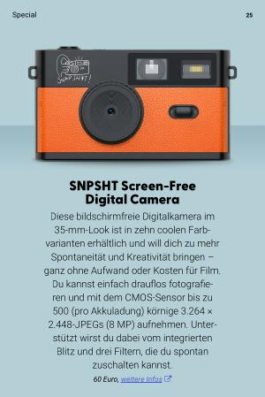 Diese bildschirmfreie Digitalkamera im 35-mm-Look ist in zehn coolen Farb- varianten erhältlich und will dich zu mehr Spontaneität und Kreativität bringen – ganz ohne Aufwand oder Kosten für Film. Du kannst einfach drauflos fotografieren und mit dem CMOS-Sensor bis zu 500( pro Akkuladung) körnige 3.264 × 2.448-JPEGs( 8 MP) aufnehmen. Unterstützt wirst du dabei vom integrierten Blitz und drei Filtern, die du spontan zuschalten kannst.