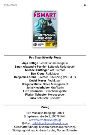 Five Monkeys Imaging GmbH, Brügelmannstraße 3, 50579 Köln www. fivemonkeys. group E-Mail: redaktion @ smart-weekly. de Geschäftsführung: Myriam Karsch( Sprecherin), Wolfgang Heinen, Andreas Laube, Florian Schuster