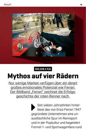Ferrari Hardcover 688 Seiten 125 Euro www. taschen. com den Tagebüchern des charismatischen Firmengründers Enzo Ferrari. Der Bildband Ferrari ist ein Muss für alle Technikverrückten mit Benzin im Blut.