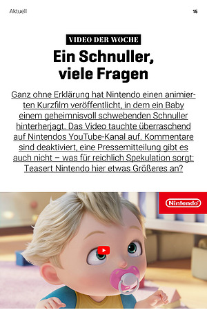 Ganz ohne Erklärung hat Nintendo einen animierten Kurzfilm veröffentlicht, in dem ein Baby einem geheimnisvoll schwebenden Schnuller hinterherjagt. Das Video tauchte überraschend auf Nintendos YouTube-Kanal auf. Kommentare sind deaktiviert, eine Pressemitteilung gibt es auch nicht – was für reichlich Spekulation sorgt: Teasert Nintendo hier etwas Größeres an?