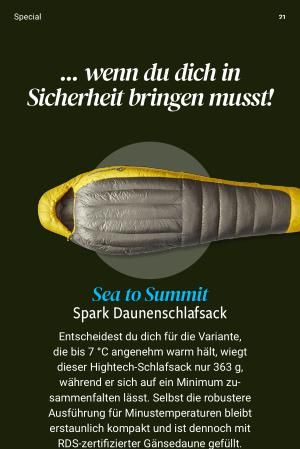 Entscheidest du dich für die Variante, die bis 7 ° C angenehm warm hält, wiegt dieser Hightech-Schlafsack nur 363 g, während er sich auf ein Minimum zusammenfalten lässt. Selbst die robustere Ausführung für Minustemperaturen bleibt erstaunlich kompakt und ist dennoch mit RDS-zertifizierter Gänsedaune gefüllt. Hinzu kommen eine wasserabweisende, atmungsaktive Kapuze und Fußbox. Es sind auch spezielle Damenversionen und Modelle für größere Personen verfügbar. 330 Euro, weitere Infos �