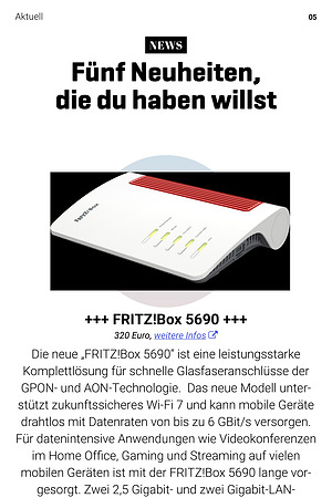 Die neue „ FRITZ! Box 5690“ ist eine leistungsstarke Komplettlösung für schnelle Glasfaseranschlüsse der GPON- und AON-Technologie. Das neue Modell unterstützt zukunftssicheres Wi-Fi 7 und kann mobile Geräte drahtlos mit Datenraten von bis zu 6 GBit / s versorgen. Für datenintensive Anwendungen wie Videokonferenzen im Home Office, Gaming und Streaming auf vielen mobilen Geräten ist mit der FRITZ! Box 5690 lange vorgesorgt. Zwei 2,5 Gigabit- und zwei Gigabit-LAN- Anschlüsse sowie das vielseitige FRITZ!-Komfortpaket für Telefonie, Smart Home und Multimedia machen die FRITZ! Box 5690 zur perfekten Heimnetzzentrale am Glasfaseranschluss. Anwender profitieren vom nachhaltigen Konzept der FRITZ! Box mit einem energieeffizienten Betrieb, regelmäßigen Updates und einer langjährigen Produktpflege.