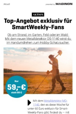 1140 , den es diese Woche für unter 60 Euro exklusiv für Smart- Weekly-Fans gibt , findest du – mit etwas Glück – verborgene Schätze . Denn dank des leistungsstarken Detektors spürst du metallische Gegenstände unter dem Sand oder der Erde ganz einfach auf . Dabei hilft dir das gut lesbare , analoge Display , das entsprechend bei einem Fund stärker ausschlägt . Zudem führt dich ein Signalton via Kopfhörer auf die richtige Fährte . Gesucht wird übrigens mit einer wasserdichten Suchsonde , die einen Durchmesser von 188 Millimetern bietet . So deckst du einen großen Radius ab und kommst deinem Ziel schnell näher . Praktisch auch , wenn du etwa deine Uhr oder deinen Ehering am Strand oder im Garten verloren hast . Hier unterstützt dich der MD-1140 beim erfolgreichen Wiederfinden .