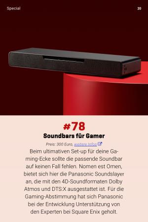 Preis : 300 Euro , weitere Infos � Beim ultimativen Set-up für deine Gaming-Ecke sollte die passende Soundbar auf keinen Fall fehlen . Nomen est Omen , bietet sich hier die Panasonic Soundslayer an , die mit den 4D-Soundformaten Dolby Atmos und DTS : X ausgestattet ist . Für die Gaming-Abstimmung hat sich Panasonic bei der Entwicklung Unterstützung von den Experten bei Square Enix geholt .