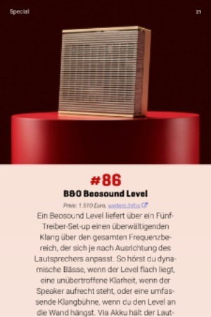 Preis : 1.510 Euro , weitere Infos � Ein Beosound Level liefert über ein Fünf- Treiber-Set-up einen überwältigenden Klang über den gesamten Frequenzbereich , der sich je nach Ausrichtung des Lautsprechers anpasst . So hörst du dynamische Bässe , wenn der Level flach liegt , eine unübertroffene Klarheit , wenn der Speaker aufrecht steht , oder eine umfassende Klangbühne , wenn du den Level an die Wand hängst . Via Akku hält der Lautsprecher bis zu 16 Stunden durch .