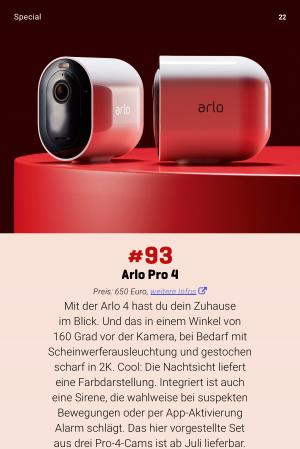 Preis : 650 Euro , weitere Infos � Mit der Arlo 4 hast du dein Zuhause im Blick . Und das in einem Winkel von 160 Grad vor der Kamera , bei Bedarf mit Scheinwerferausleuchtung und gestochen scharf in 2K . Cool : Die Nachtsicht liefert eine Farbdarstellung . Integriert ist auch eine Sirene , die wahlweise bei suspekten Bewegungen oder per App-Aktivierung Alarm schlägt . Das hier vorgestellte Set aus drei Pro-4-Cams ist ab Juli lieferbar .
