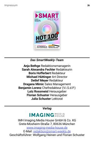IMH Imaging Media House GmbH & Co . KG Grete-Mosheim-Straße 7 , 80636 München www . imaging-media-house . de E-Mail : redaktion @ smart-weekly . de Geschäftsführer : Wolfgang Heinen und Florian Schuster