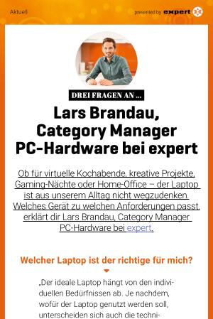 Ob für virtuelle Kochabende , kreative Projekte , Gaming-Nächte oder Home-Office – der Laptop ist aus unserem Alltag nicht wegzudenken . Welches Gerät zu welchen Anforderungen passt , erklärt dir Lars Brandau , Category Manager PC-Hardware bei expert .