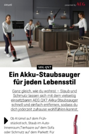 Ob Krümel auf dem Frühstückstisch , Staub im Auto- Innenraum , Tierhaare auf dem Sofa oder Schmutz auf dem Parkett : Für eine flexible und effiziente Reinigung vom Boden bis zur Decke sorgt der QX7 2in1 Akku-Staubsauger von AEG . Dieser kombiniert einen Akku- Staubsauger und einen integrierten Handstaubsauger im praktischen 2in1-Design . Mit nur einem Handgriff entnimmst du den Handstaubsauger , um von seinen vielseitigen Anwendungsmöglichkeiten Gebrauch zu machen . Das handliche Gerät erweitert die Einsatzmöglichkeiten der QX7-Staubsauger erheblich und sorgt für vielseitige Flexibilität in der ganzen Wohnung .