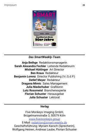 Five Monkeys Imaging GmbH, Brügelmannstraße 3, 50579 Köln www. fivemonkeys. group E-Mail: redaktion @ smart-weekly. de Geschäftsführung: Myriam Karsch( Sprecherin), Wolfgang Heinen, Andreas Laube, Florian Schuster