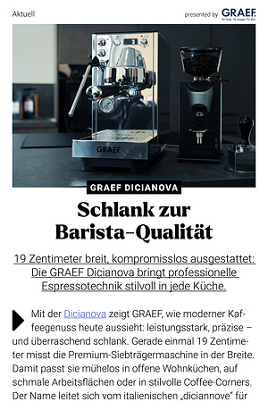 19 Zentimeter breit, kompromisslos ausgestattet: Die GRAEF Dicianova bringt professionelle Espressotechnik stilvoll in jede Küche.