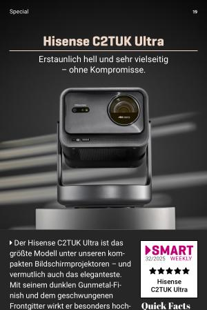 � Der Hisense C2TUK Ultra ist das größte Modell unter unseren kompakten Bildschirmprojektoren – und vermutlich auch das eleganteste. Mit seinem dunklen Gunmetal-Finish und dem geschwungenen Frontgitter wirkt er besonders hochwertig. Der Projektor ist vollständig in einen kardanisch gelagerten Standfuß integriert und lässt sich horizontal um 360 Grad sowie vertikal um bis zu 135 Grad schwenken. Damit ist er extrem flexibel: Ob an die Wand oder an die Decke – du entscheidest, wo das Heimkinoerlebnis stattfinden soll. Egal ob actionreicher Marvel-Blockbuster oder spannender Thriller über dem Bett – der C2TUK Ultra passt sich Ihrem