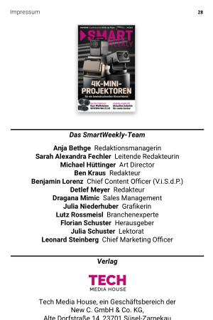 Tech Media House, ein Geschäftsbereich der New C. GmbH & Co. KG, Alte Dorfstraße 14, 23701 Süsel-Zarnekau www. new-c. de E-Mail: redaktion @ smart-weekly. de Geschäftsführer: Wolfgang Heinen und Florian Schuster