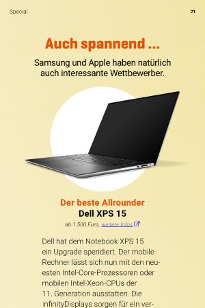 Dell hat dem Notebook XPS 15 ein Upgrade spendiert . Der mobile Rechner lässt sich nun mit den neuesten Intel-Core-Prozessoren oder mobilen Intel-Xeon-CPUs der 11 . Generation ausstatten . Die InfinityDisplays sorgen für ein vergrößertes Sichtfeld sowie eine brillante Farbdarstellung , die Bilder und Designs zum Leben erweckt . Das XPS 15 ist optional mit OLED-Bildschirm verfügbar . Das edle Design und die zahlreichen Sicherheits- Features ( Fingerabdruckscanner und Windows-Hello-Unterstützung ) machen dieses Notebook zu einem der besten Laptops auf dem Markt .