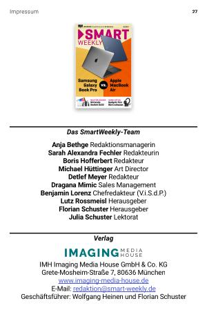 IMH Imaging Media House GmbH & Co . KG Grete-Mosheim-Straße 7 , 80636 München www . imaging-media-house . de E-Mail : redaktion @ smart-weekly . de Geschäftsführer : Wolfgang Heinen und Florian Schuster