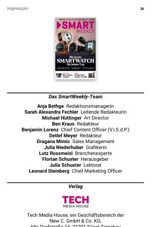 Tech Media House, ein Geschäftsbereich der New C. GmbH & Co. KG, Alte Dorfstraße 14, 23701 Süsel-Zarnekau www. new-c. de E-Mail: redaktion @ smart-weekly. de Geschäftsführer: Wolfgang Heinen und Florian Schuster