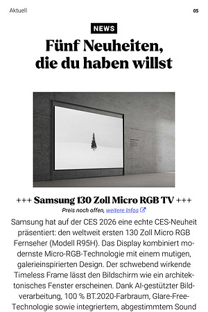 Samsung hat auf der CES 2026 eine echte CES- Neuheit präsentiert: den weltweit ersten 130 Zoll Micro RGB Fernseher( Modell R95H). Das Display kombiniert modernste Micro-RGB-Technologie mit einem mutigen, galerieinspirierten Design. Der schwebend wirkende Timeless Frame lässt den Bildschirm wie ein architektonisches Fenster erscheinen. Dank AI-gestützter Bildverarbeitung, 100 % BT. 2020-Farbraum, Glare-Free- Technologie sowie integriertem, abgestimmtem Sound wird der Fernseher zum zentralen Blickfang für ein beeindruckendes Premium-TV-Erlebnis.