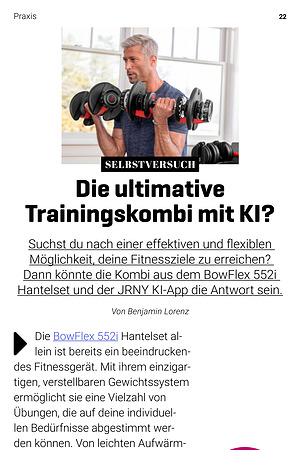 Ben Lorenz , Fitnessfan bringt das Trainingserlebnis jedoch erst auf ein smartes Level . Denn mit einem intuitiven Design und benutzerfreundlicher Navigation wird die KI-App zum Personal Coach für dein BowFlex-Training . Sie bietet anpassbare Trainingspläne und Workouts , die auf deine Ziele , dein Fitnesslevel und sogar deine bevorzugte Musik abgestimmt sind . Das motiviert und macht Spaß . Zudem erkennt sie über die Kamera des iPads Bewegungen , analysiert diese und gibt passendes Feedback .