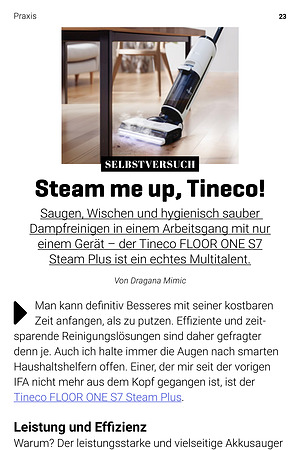 Zeit anfangen , als zu putzen . Effiziente und zeitsparende Reinigungslösungen sind daher gefragter denn je . Auch ich halte immer die Augen nach smarten Haushaltshelfern offen . Einer , der mir seit der vorigen IFA nicht mehr aus dem Kopf gegangen ist , ist der Tineco FLOOR ONE S7 Steam Plus .