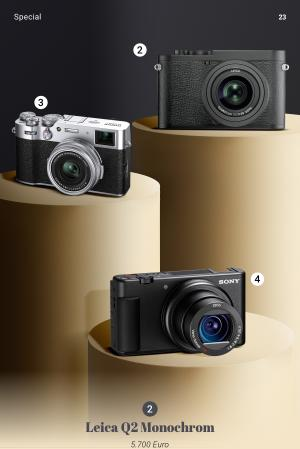 3 Fujifilm X100V 1.400 Euro Diese wetterfeste Premium-Kompaktkamera mit neu entwickelter 23-mm-f / 2 Festbrennweite , weiter verbessertem Hybridsucher und einem klappbaren Touch-LCD ist das ideale Werkzeug für alle , die ihre Kreativität in der Foto- und Videografie individuell zum Ausdruck bringen möchten . Hochpreisig , aber jeden Cent wert . Weitere Infos �
