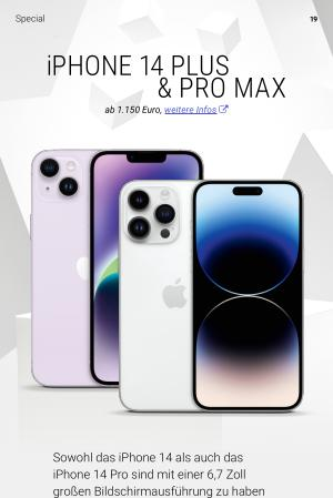 Sowohl das iPhone 14 als auch das iPhone 14 Pro sind mit einer 6,7 Zoll großen Bildschirmausführung zu haben und heißen dann iPhone 14 Plus bzw . iPhone 14 Pro Max . Wieso einmal Plus und einmal Max als Modellnamenergänzung gewählt wurde , bleibt Apples Geheimnis . Wer aber etwas mehr Bildschirmfläche benötigt , um etwa YouTube- Videos , Netflix & Co . auch mobil zu genießen , ist mit den Plus- und Max-Modellen perfekt bedient . Alle weiteren technischen Spezifikationen