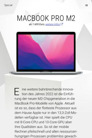ine weitere bahnbrechende Innovation des Jahres 2022 ist die Einführung der neuen M2-Chipgeneration in die MacBook Pro-Modelle von Apple . Aktuell ist es so , dass der flotteste Prozessor aus dem Hause Apple nur in den 13,3-Zoll-Modellen verfügbar ist . Hier spielt die CPU mit 8-Core-CPU und 10-Core-GPU aber ihre Qualitäten aus . So ist der mobile Rechner pfeilschnell und allen ressourcenhungrigen Prozessen problemlos gewachsen . Dabei arbeitet das MacBook Pro mit M2 auch unter Volllast superleise . Immerhin kommt im MacBook Pro mit M2 – im Gegensatz zum MacBook Air mit M2 – ein Lüfter zum Einsatz . Ungewöhnlich ist , dass das Design des Vorgängermodells weitgehend beibehalten wurde . Ebenso irritiert , dass das MacBook Pro M2 noch mit der Touch Bar ausgestattet wurde , die in anderen Modellen schon wieder verschwunden ist . Hier sind die MacBook Pro-Modelle mit 14 bzw . 16 Zoll moderner , aber eben noch nicht mit M2 zu haben .