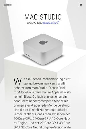 beherzt zum Mac Studio . Dieses Desktop-Modell aus dem Hause Apple ist wirklich ein Biest . Optisch erinnert er an ein paar übereinandergestapelte Mac Minis – drinnen steckt aber jede Menge Leistung . Und die ist je nach Nutzeranspruch skalierbar . Nicht nur , dass man zwischen der 10‐Core CPU , 24‐Core GPU , 16‐Core Neural Engine- und der 20‐Core CPU , 48‐Core GPU , 32‐Core Neural Engine-Version wählen kann : Wer bei der Bestellung alle Mausklicks in der Topausstattung ausführt , ist für den Rechner über 9.000 Euro los – Tastatur , Maus und Monitor sind in diesem Set-up natürlich noch nicht enthalten .