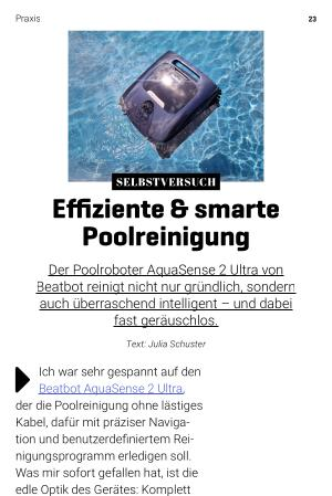 Sobald der Beatbot im Wasser ist und das gewählte Reinigungsprogramm startet, scannt er die Beckenstruktur, erstellt eine Reinigungsroute und fährt sie sichtbar systematisch ab. Dabei arbeitet er erstaunlich leise und reinigt dank Dual-Motor-System und 4-Rad- Antrieb auch Wände und Stufen. Bislang mussten wir nach der Poolreinigung mit unserem alten, kabelgebundenen Roboter noch mit Kescher und Schwamm nacharbeiten – insbesondere an der Wasserlinie, wo sich Sonnencreme hartnäckig absetzt. Der AquaSense 2 Ultra reinigt deutlich effizienter, auch wenn die Wasserlinie weiterhin Nacharbeit erfordert – jedoch viel seltener und die Ablagerungen lassen sich deutlich leichter lösen. Mein Lieblingsprogramm ist der „ KI-Schnellmodus“: In diesem Modus sucht und findet der Beatbot gezielt Verunreinigungen am Boden und an der Wasseroberfläche und beseitigt sie schnell und gründlich. Das wird ein entspannter Poolsommer ohne viel Putzarbeit!