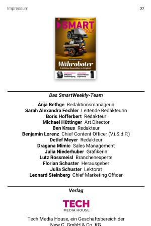 Tech Media House, ein Geschäftsbereich der New C. GmbH & Co. KG, Alte Dorfstraße 14, 23701 Süsel-Zarnekau www. new-c. de E-Mail: redaktion @ smart-weekly. de Geschäftsführer: Wolfgang Heinen und Florian Schuster